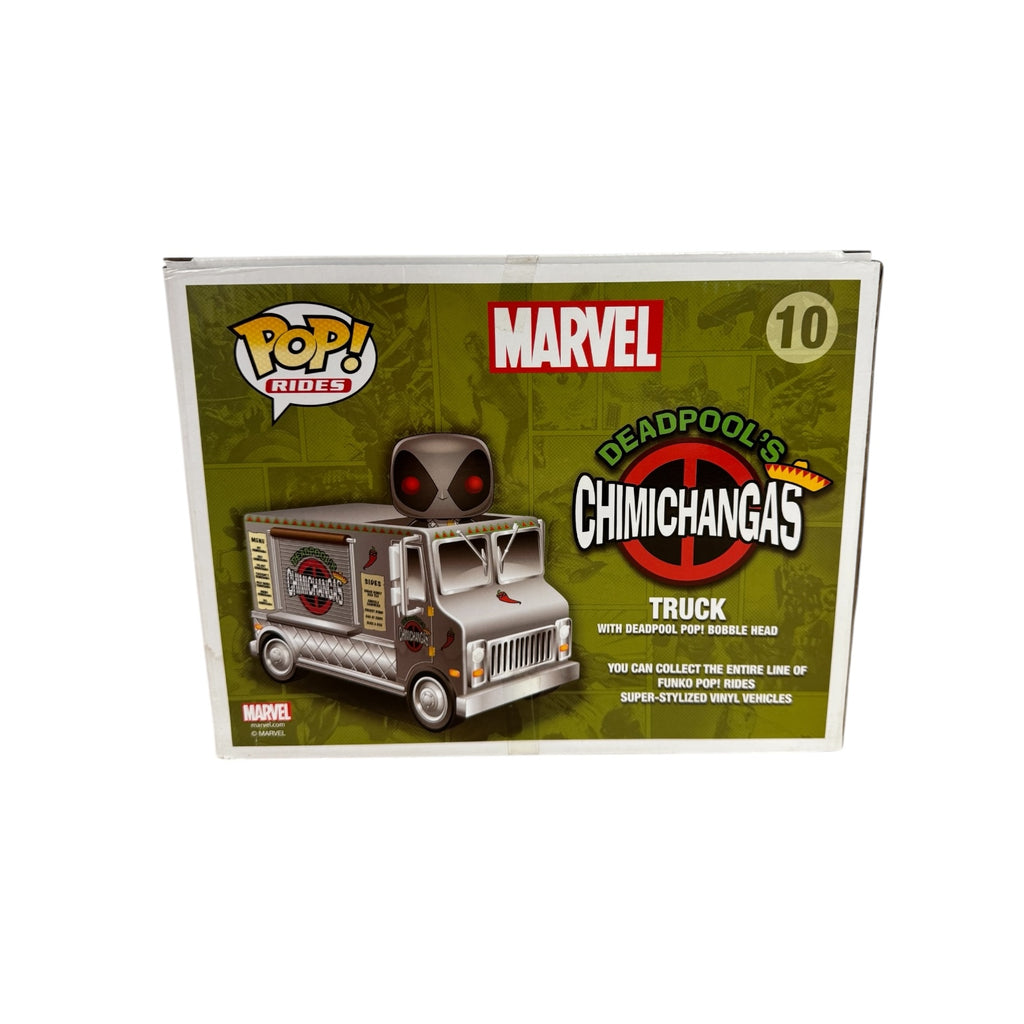 Indulge in some chimichangas with this quirky Deadpool's Chimichanga Truck #10 Funko Pop Ride! This 2015 SDCC Shared Exclusive brings the Merc with a Mouth to your collection in his signature food truck. In fair condition (7/10), this figure will make for a fun addition to any Marvel fan's display.